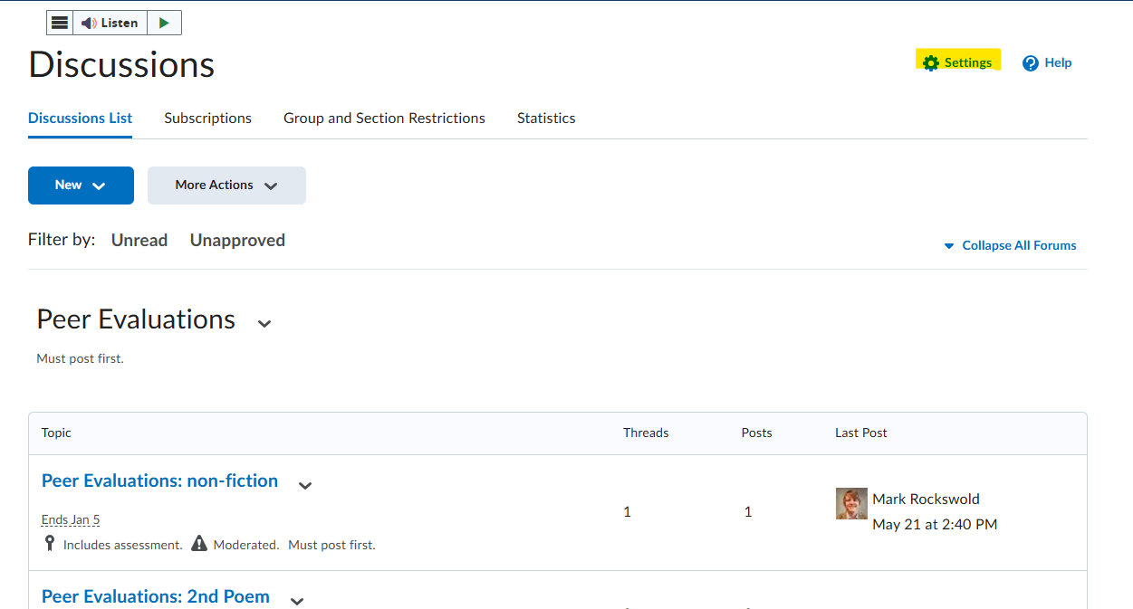 You can change the default "Reading View" in discussions to "Grid View" in order to better see multiple posts at a glance. Begin by clicking on the "Tools" dropdown in the blue navbar, then "Discussions." Next, click on the blue "Settings" cog at the top right of the page.