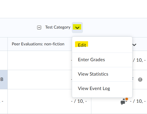 Begin by clicking on the "Grades" tab. Next, click on the caret next to a category and click "Edit"