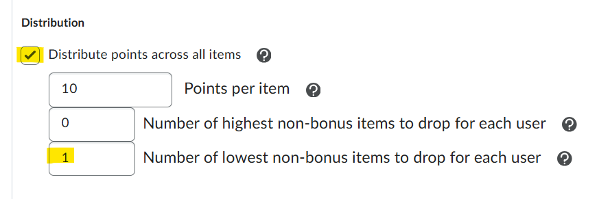Scroll down to the "Distribution" area and click the box next to "distribute points across all items", then type the number of low scores you would want the gradebook to drop in that category.