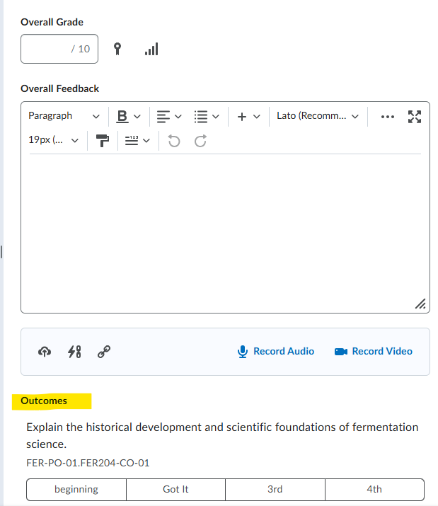 Click on the name of the student to evaluate. From here you can enter the overall grade, feedback, and then scroll down to the "Outcomes" section. Select the appropriate achievement level.