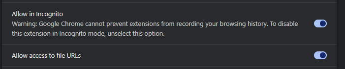 3. Select "Allow in incognito" and "Allow access to file URLs"