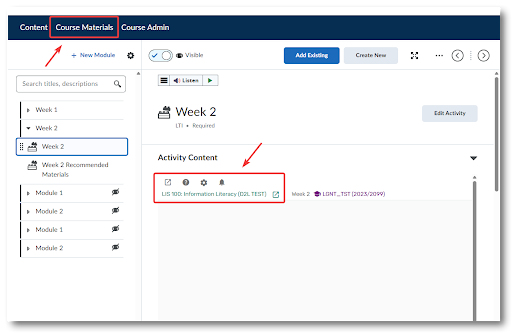 2) Students and instructors can click the Course Materials link in the navigation bar to open the full list within D2L
